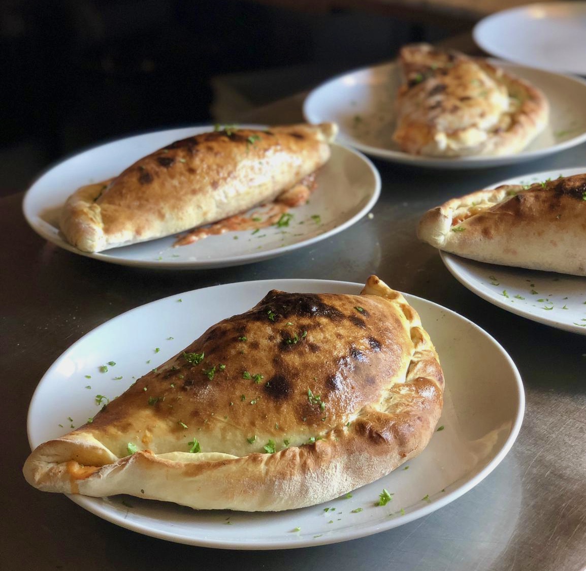Dubbelgevouwen pizza met tomatensaus, kaas, ham, salami, paprika, champignons en ui