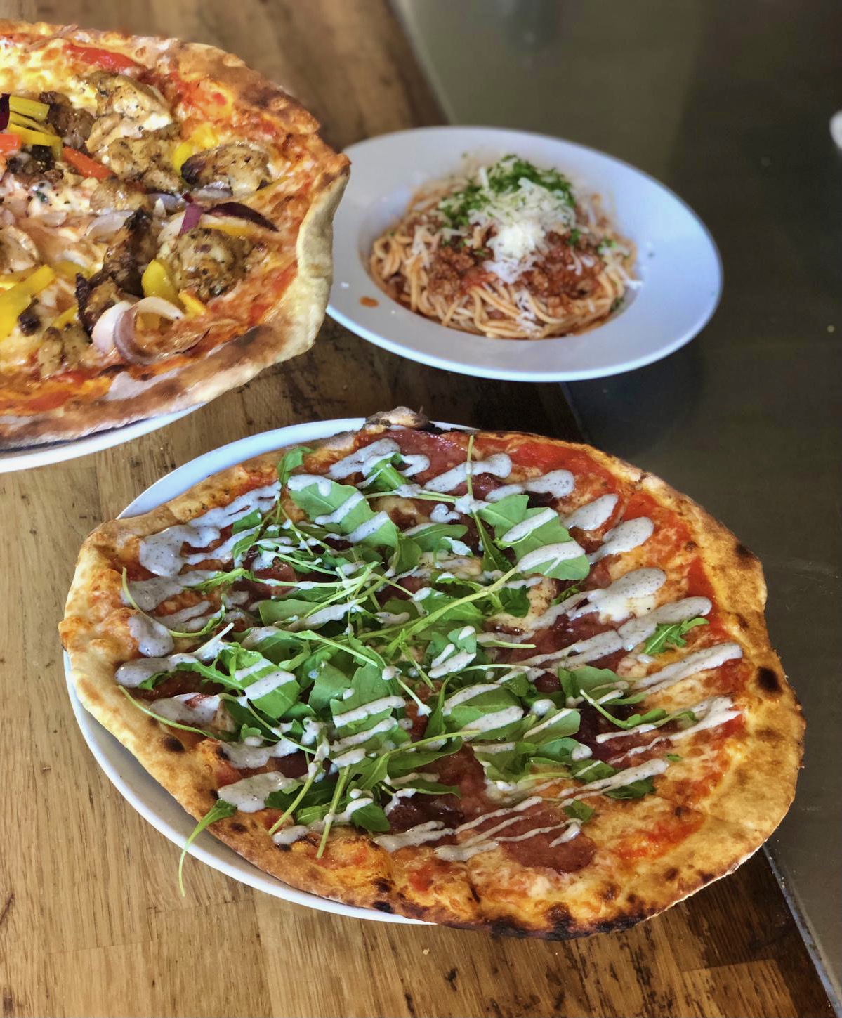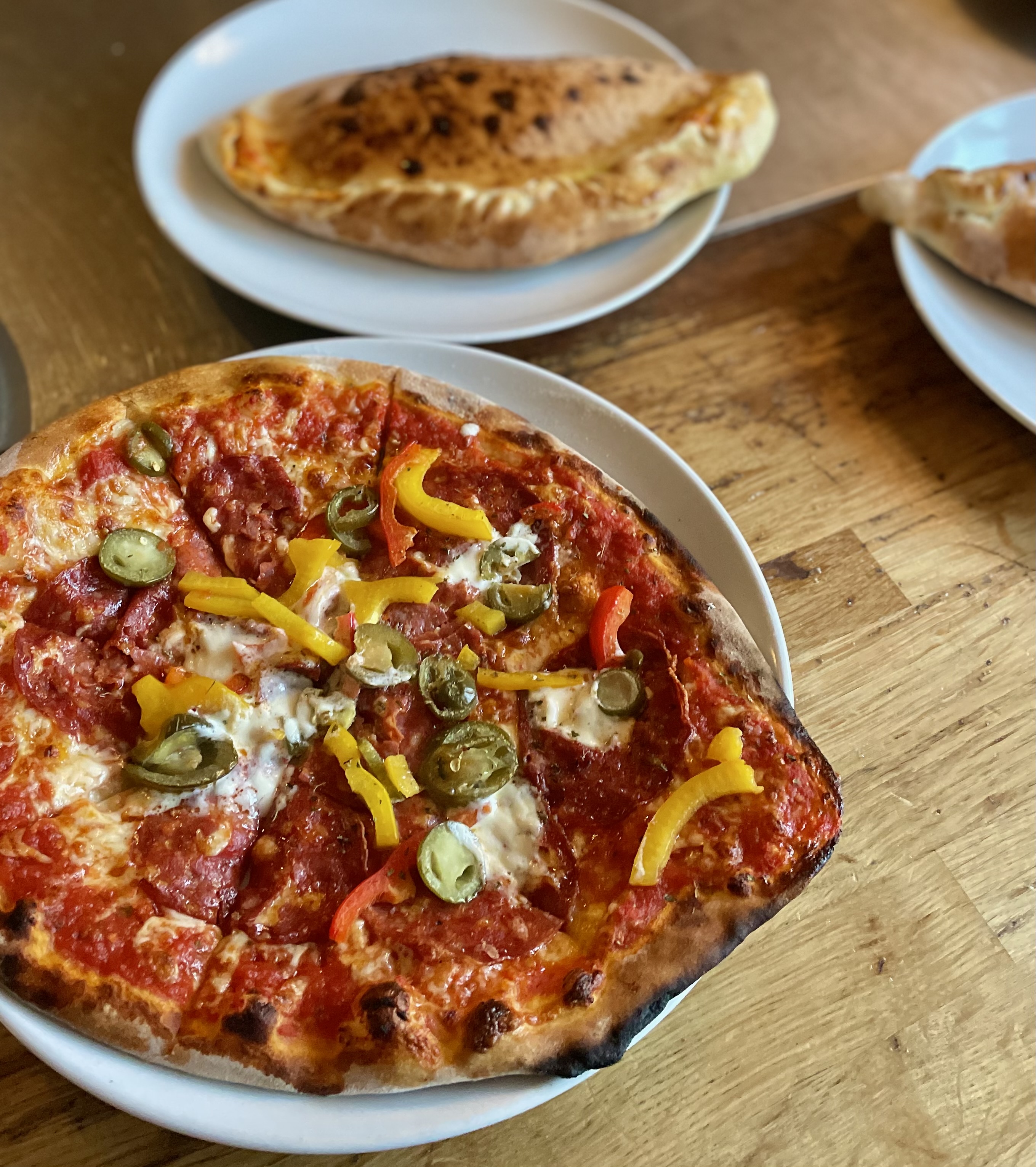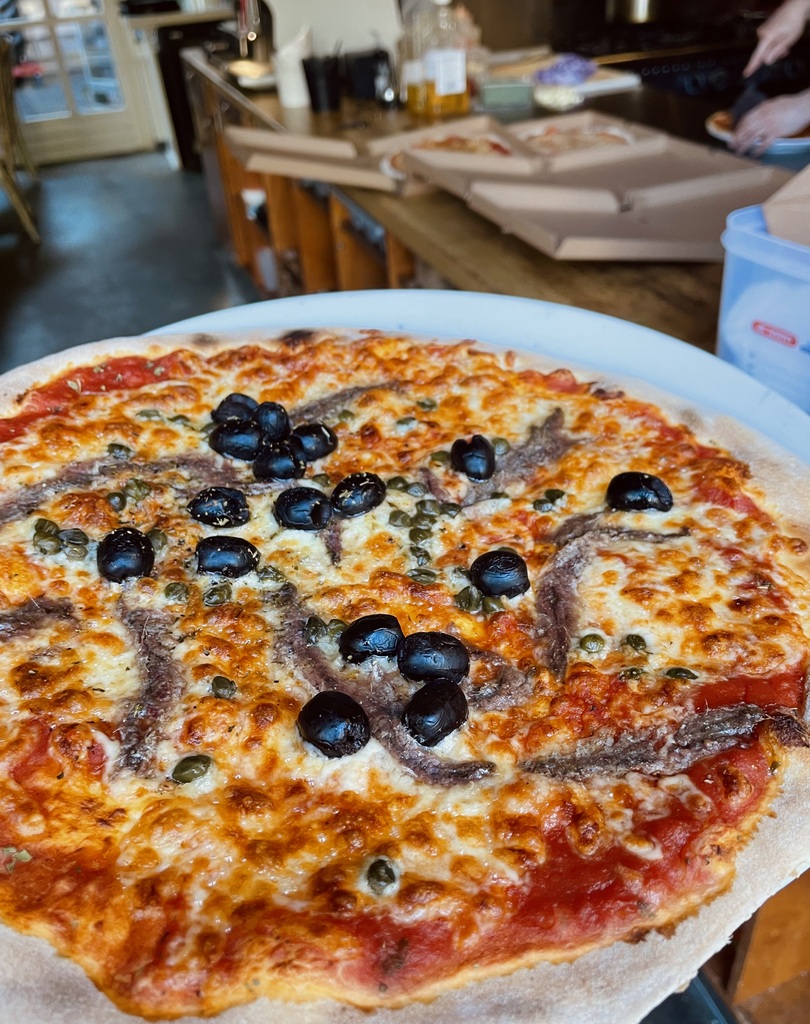 Pizza met Spianata Romana, truffel-mayonaise, mozzarella en rucola