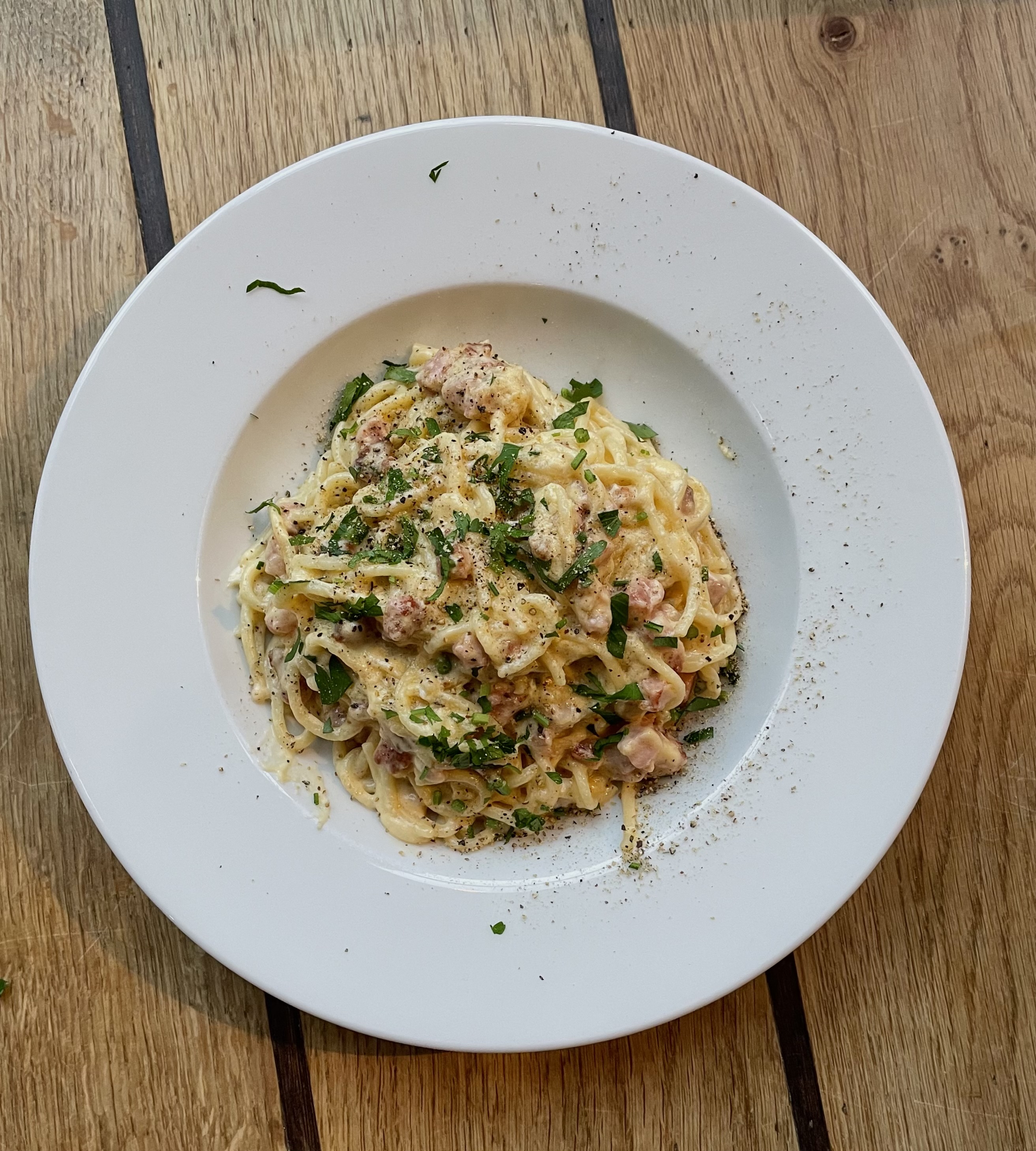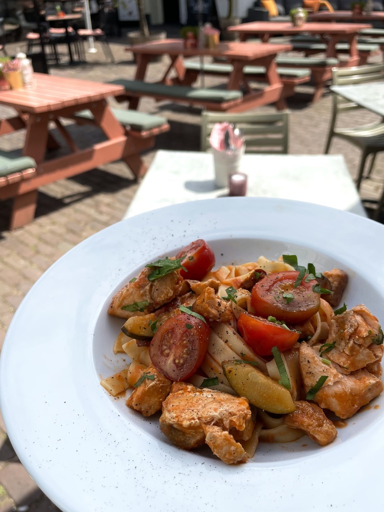 Pasta tagliatelle met zalm, gekruide tomaten, courgette, knoflook en roomsaus