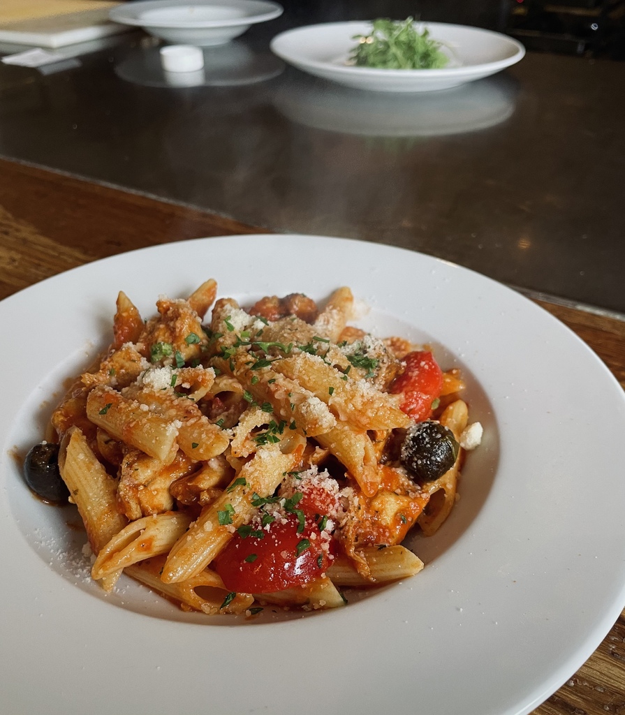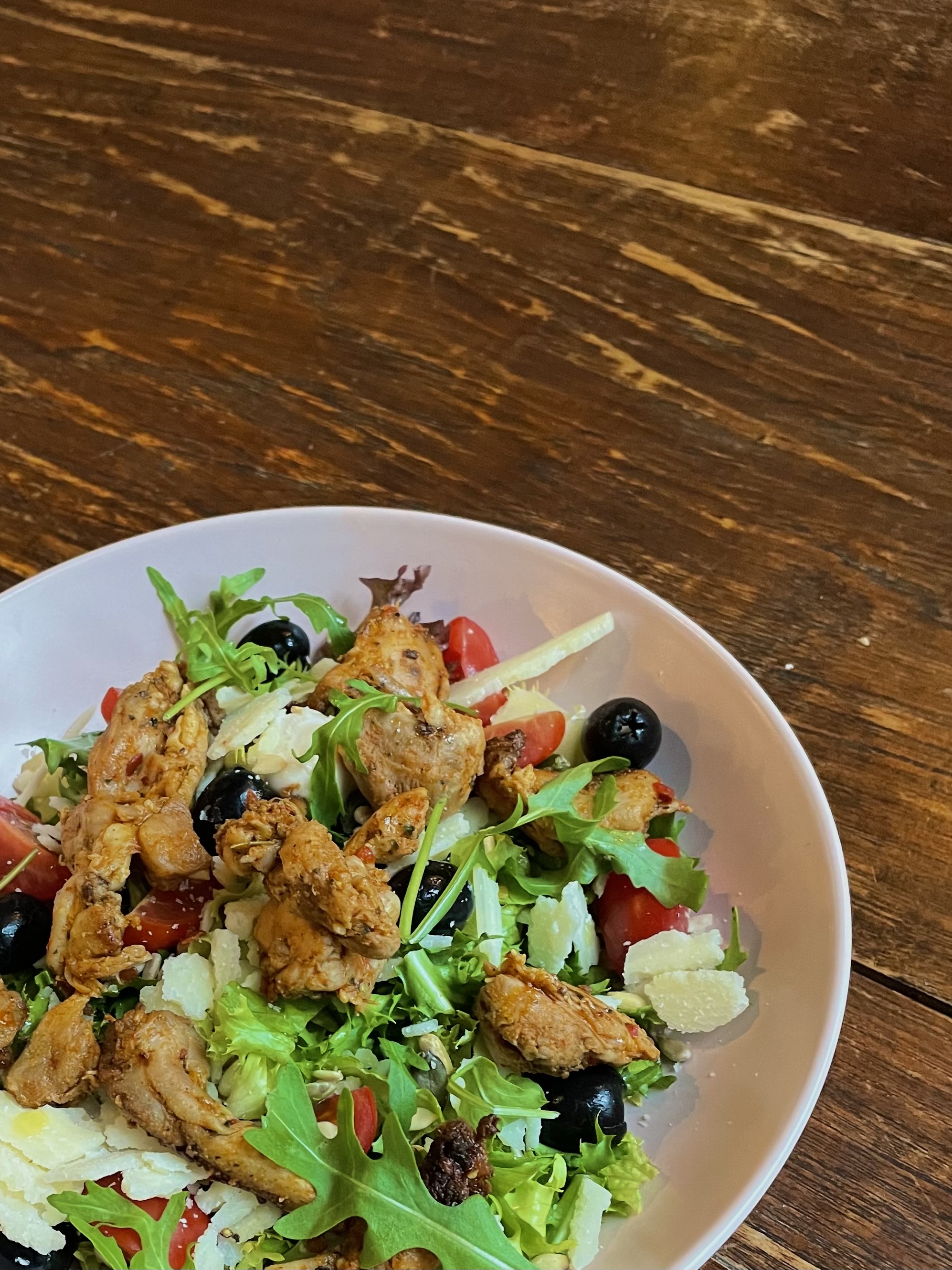 Salade met kippendij uit de houtoven met pesto, tomaat, mozzarella, Parmezaan, pijnboompitten en olijven