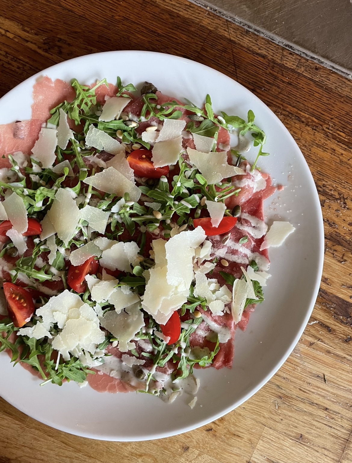 Carpaccio met truffelmayonaise, Parmezaanse kaas, tomaat, kappertjes en pitjes