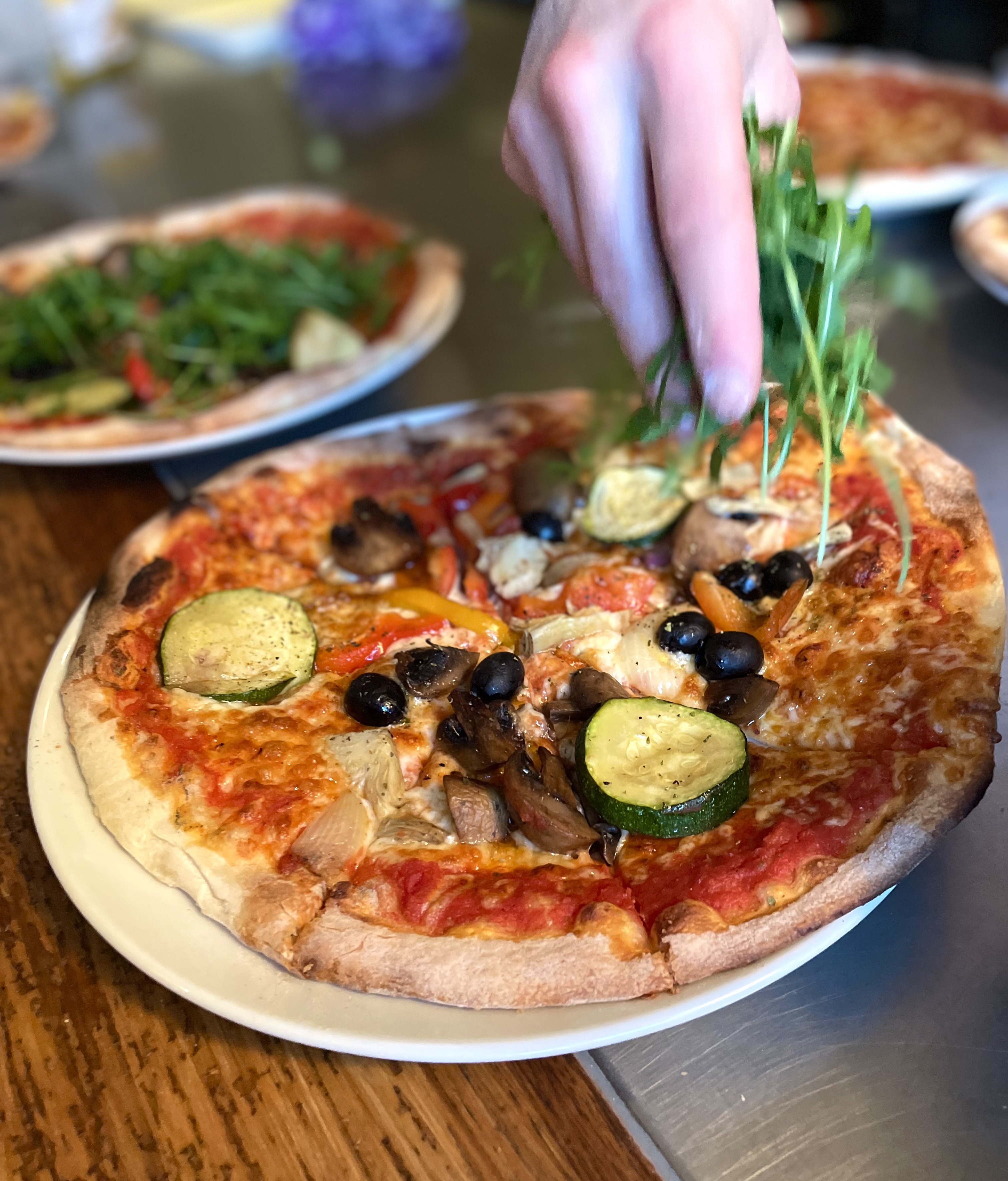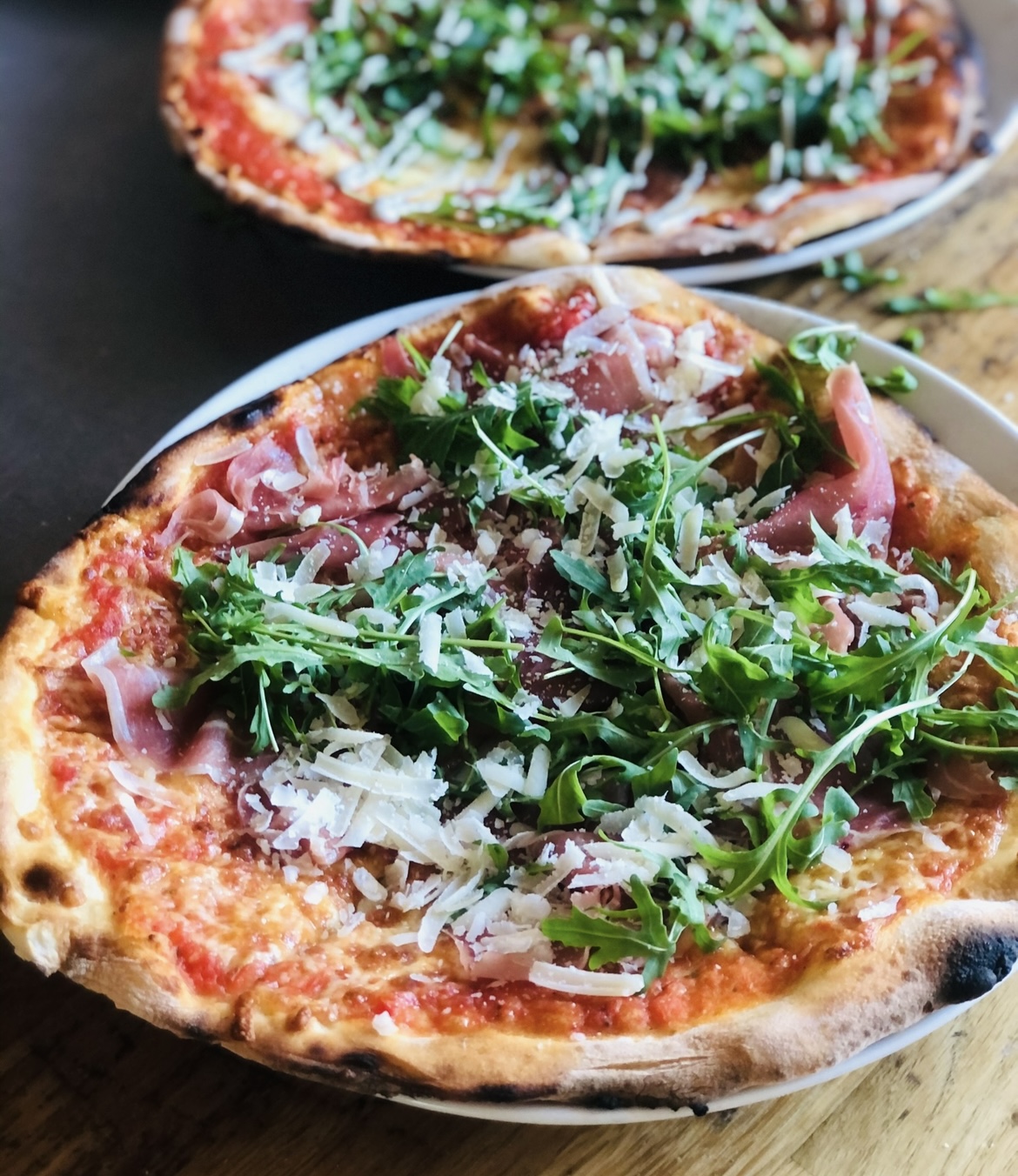 Pizza met Parmaham (18 maanden gerijpt), rucola en Parmezaanse kaas