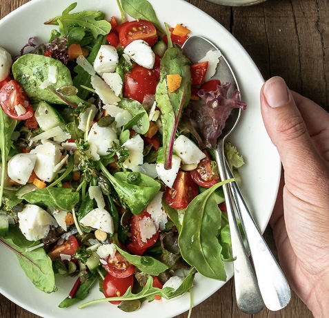 Groene salade met komkommer, tomaat, mozzarella en basilicumdressing