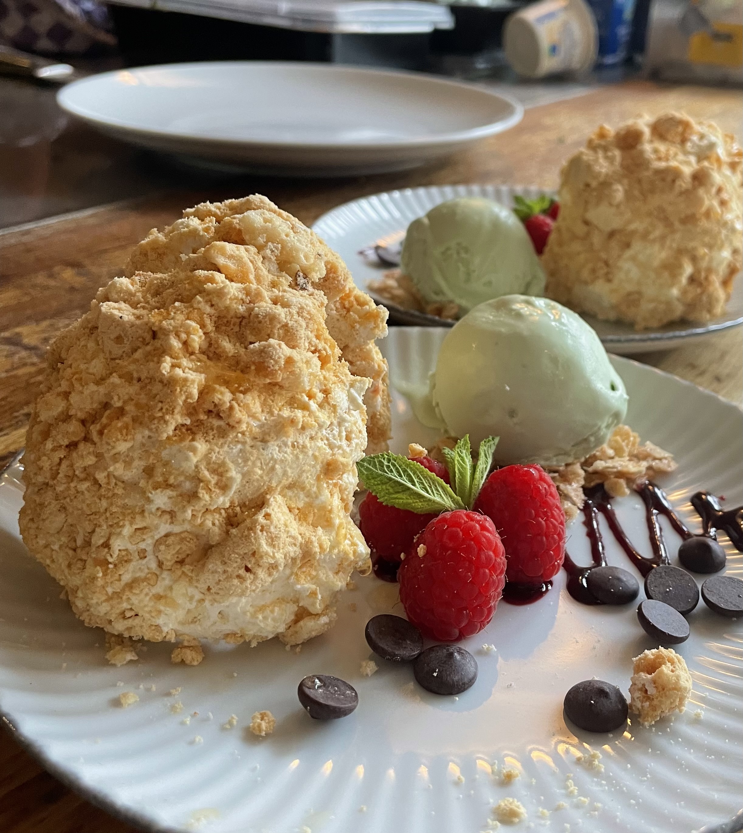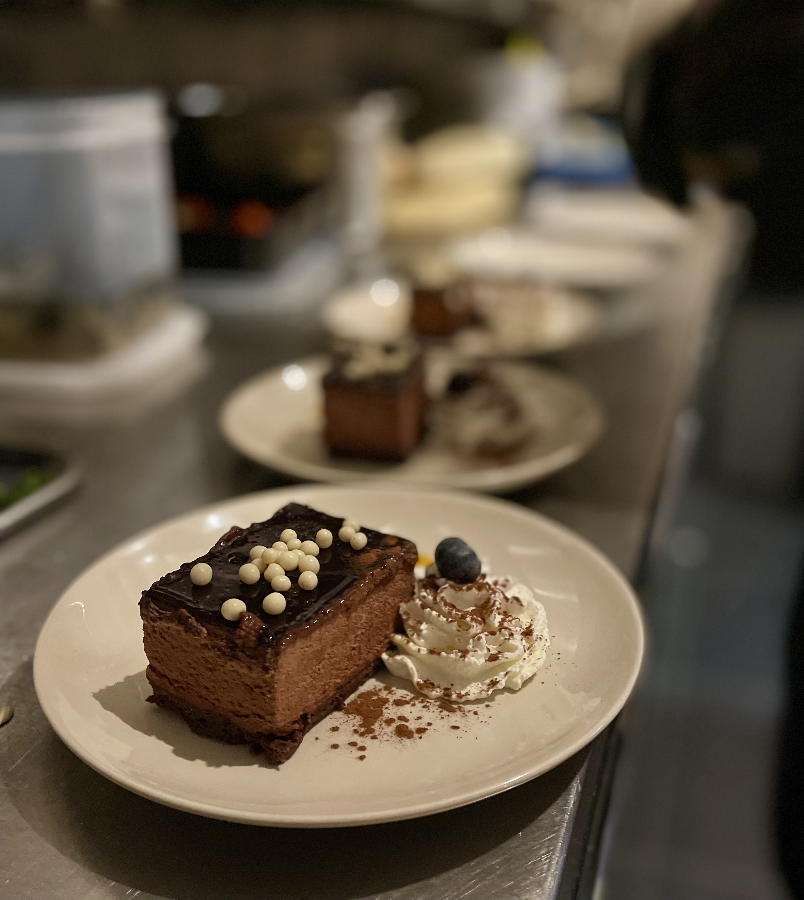 ticky toffee pudding met sinaasappelkaramel en witte chocolademousse