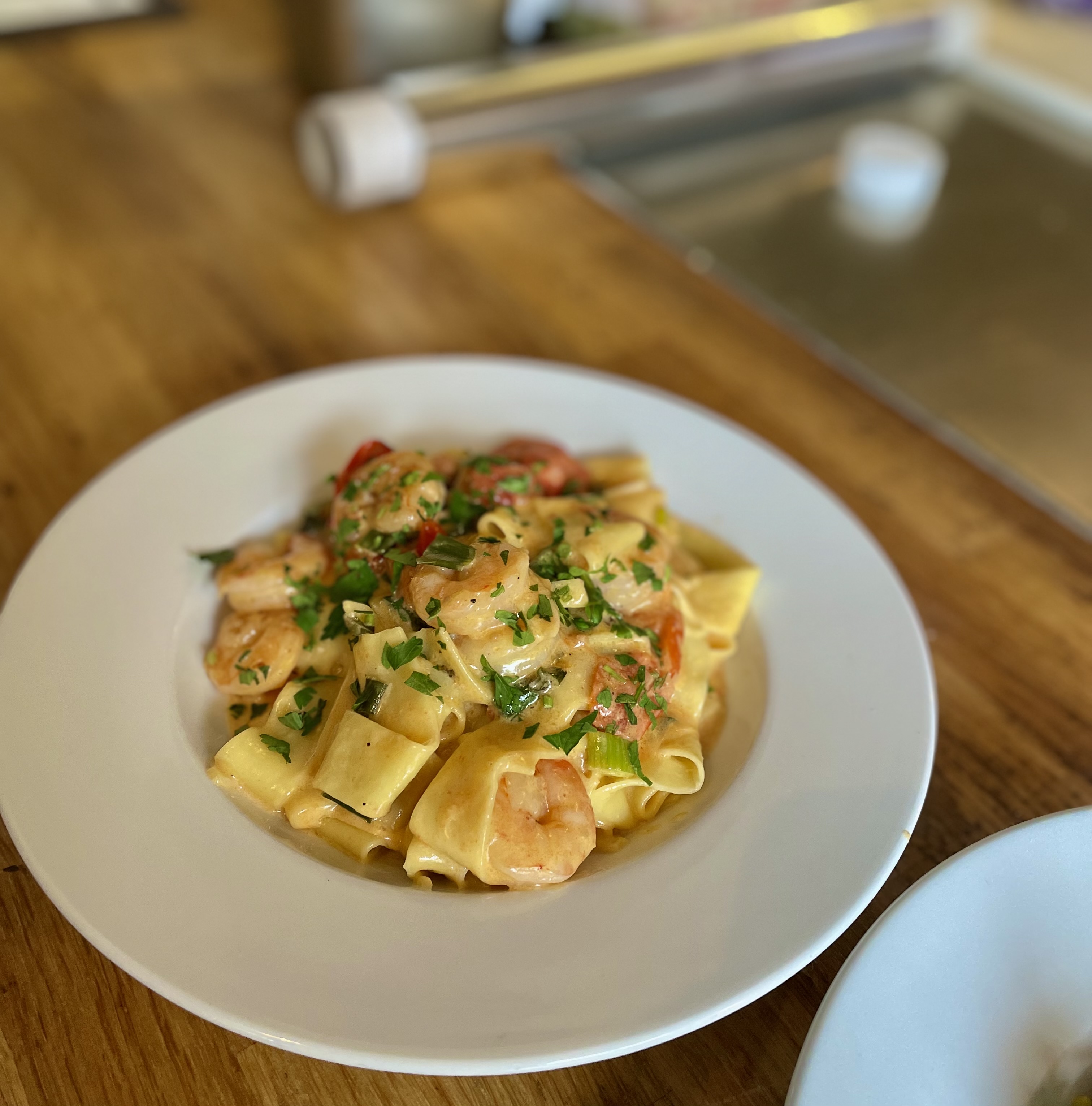 Lintpasta met gamba's, tomaat, knoflook en rode peper