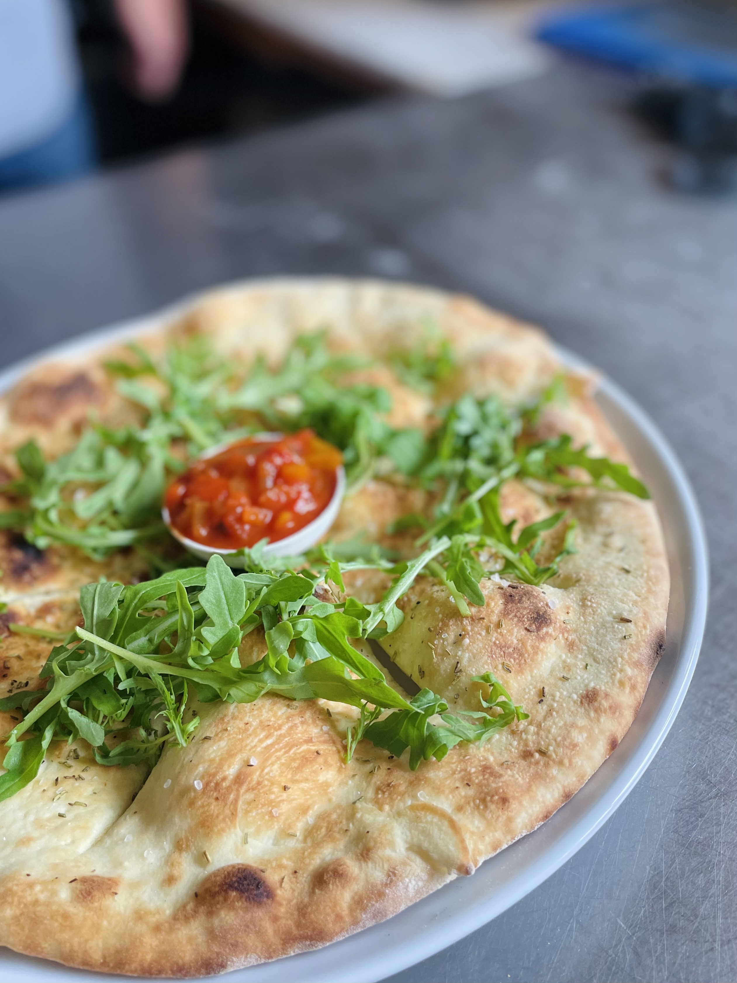 Luchtige pizza met zeezout, oregano en salsa dip.